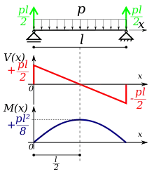 Un cas simple est constitué par une poutre droite, horizontale, de section constante, chargée uniformément et reposant sur deux appuis simples. Si on désigne par la charge constante et linéaire, et par la longueur de la poutre, la détermination des éléments de réduction des efforts tient en quelques formules simples :