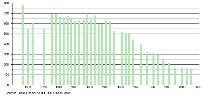 L'évolution du nombre d'habitants est connue à travers les recensements de la population effectués dans la commune depuis 1793. À partir du , les populations légales des communes sont publiées annuellement dans le cadre d'un recensement qui repose désormais sur une collecte d'information annuelle, concernant successivement tous les territoires communaux au cours d'une période de cinq ans. Pour les communes de moins de 10 000 habitants, une enquête de recensement portant sur toute la population est réalisée tous les cinq ans, les populations légales des années intermédiaires étant quant à elles estimées par interpolation ou extrapolation[3]. Pour la commune, le premier recensement exhaustif entrant dans le cadre du nouveau dispositif a été réalisé en 2006[4],[Note 1].