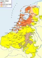 En 1566, les tensions entre les Dix-Sept Provinces et Philippe II aboutissent à la révolte des Gueux, qui devient une guerre en 1568, sous la direction de Guillaume d'Orange-Nassau. En 1579, les villes et provinces insurgées se regroupent dans l'union d'Utrecht[2], qui, en 1581 proclame la déchéance de Philippe II (acte de La Haye), ce qui est considéré comme le point de départ d'un nouvel État, les Provinces-Unies.