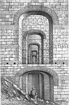 Le bâtiment principal se présente sous forme de treize murs latéraux construits entre deux murs longitudinaux, chacun de ces treize murs étant percés de trois arcs de brique superposés créant douze compartiments, chacun de 9 – 13 mètres de largeur. Les deux murs longitudinaux ne sont pas parallèles (voir illustration plus haut), mais s’écartent l’un de l’autre vers le nord [7]. Côté est, le mur contient une paire de corridors superposés aux deux étages supérieurs construits à l’intérieur des murs mêmes et éclairés par des fentes dans la façade des murs. Au rez-de-chaussée les compartiments n’ont pas de fenêtres, mais aux étages supérieurs de petites ouvertures dans le mur côté ouest permettent à la lumière d’entrer[8]. Une tour abritant un escalier en spirale relie le bâtiment principal aux deux tours[9].