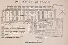 Le mur extérieur du bâtiment est d'une hauteur inhabituelle, s'élevant à 23 mètres au-dessus du sol qui lui fait face et ayant une épaisseur de 11 à 20 mètres. À l’intérieur de l'enceinte, le bâtiment comprend 12 chambres de trois étages. La façade extérieure consiste en deux tours rectangulaires construites côte-à-côte avec un mur mitoyen. Les tours jumelles sont soutenues par des contreforts massifs qui s'élèvent à près de huit mètres de haut et font une saillie de 6,5 à 9 mètres devant les deux tours[2].