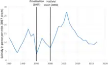 - Sécurité : le chemin de fer peut poursuivre une amélioration continue de la sécurité sous le régime de la privatisation. En fait, le taux d'amélioration a augmenté par rapport à celui enregistré dans les dernières années des British Railways. Toutefois, quatre accidents ferroviaires graves, survenus dans les années suivant la privatisation (Southall (1997), Ladbroke Grove (1999), Hatfield (2000) et Potters Bar (2002)), ont miné la confiance dans la sécurité des chemins de fer privatisés et attribué à la privatisation de nouveaux risques (par exemple la séparation de la gestion de l'infrastructure de l'exploitation des services). Le secteur ferroviaire a cherché à maîtriser ces risques et jusqu'à présent, il n'y avait plus eu de nouvel accident mortel dont le système ferroviaire ait été responsable depuis . Les deux autres accidents mortels qui s'étaient produits depuis la privatisation (Great Heck en 2001 et Ufton Nervet en 2004) ont été causés par des voitures bloquées sur les voies et heurtées à pleine vitesse. Mais, le vendredi , le train grande vitesse "pendolino" Londres-Glasgow appartenant à la compagnie Virgin Trains, a déraillé à cause d'une anomalie liée à l'infrastructure ferroviaire, causant un mort et plusieurs blessés. En 2013, les autorités britanniques considèrent que leur réseau ferroviaire est l'un plus sûr d'Europe[4],[5].