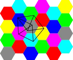 La borne supérieure provient de l'existence d'un pavage du plan par des hexagones réguliers de diamètre un peu inférieur à 1, que l'on peut colorier périodiquement en 7 couleurs (cette coloration est connue sous le nom de carte de Heawood[10]), ce qui fut remarqué par John R. Isbell[Quand ?][11].
