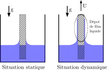 La situation dynamique consiste à retirer la plaque du bain liquide. On supposera que la vitesse de la plaque est faible. On observe expérimentalement un entraînement du liquide sur la plaque[4], qui se dépose sous la forme d'un film plat d'épaisseur . Dans le cadre applicatif de dépôts de couche mince, tout l'enjeu consiste à évaluer cette épaisseur de film liquide déposé en fonction de la vitesse de retrait de la plaque.