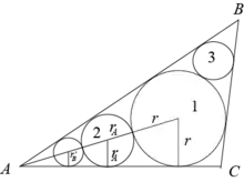 - déterminer trois cercles tracés à l'intérieur d'un triangle, de sorte que chaque cercle soit tangent aux deux autres et à deux côtés du triangle,