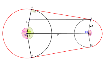 Il est clair que les triangles ACO et ADO sont des triangles rectangles isométriques, de même que les triangles BEO et BFO. De plus, les triangles ACO et BEO sont semblables. Donc les angles CAO, DAO, EBO et FBO sont tous égaux. En désignant cet angle par (mesuré en radians), la longueur de la ceinture est