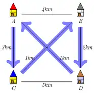 - Problème du voyageur de commerce asymétrique : Étant donné un ensemble de nœuds et de distances pour chaque paire de nœuds, trouver un cycle de longueur minimale qui visite chaque nœud exactement une fois. Cette fois-ci la distance entre deux nœuds et d'une arête n'est pas forcément la même qu'on aille de à ou bien de à .