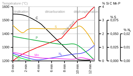 Pendant la déphosphoration, le phosphore oxydé migre dans le laitier. La forte élévation de la température s'explique par l'aspect exothermique de l'oxydation de cet élément. En effet, alors que la contribution thermique de la combustion du carbone, du fer et du manganèse n'est que de quelques degrés, la combustion de 1 % de silicium élève la température du bain de 300 °C et celle de 1 % de phosphore l'augmente de 183 °C[L 5]. Mais au bout du compte, si le soufflage du procédé Thomas génère plus de chaleur que le procédé Bessemer, il faut tenir compte du fait qu'il faut y réchauffer une grande quantité de chaux[14].