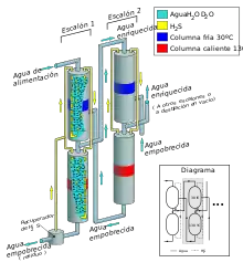 De l'eau normale, contenant naturellement un peu de deutérium, est envoyée dans la tour chaude avec du sulfure d'hydrogène : à cette température, le deutérium a tendance à migrer de cette eau (ainsi appauvrie) vers le sulfure d'hydrogène. Celui-ci est ensuite envoyé dans la tour froide, avec de l'eau déminéralisée et dégazéifiée : à cette température, le deutérium a tendance à migrer du sulfure d'hydrogène vers cette eau, qui est ainsi enrichie en deutérium. En répétant l'opération sur cette eau, on l'enrichit à nouveau.
