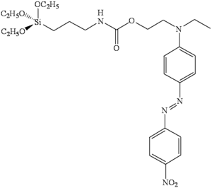 La figure 8f représente une molécule colorée de type azobenzène greffée sur un précurseur sol-gel. Ce produit a été préparé à partir d’alkoxysilane fonctionnalisé de formule F-R’-Si(OEt)3, où F est une fonction chimique, par exemple un groupe amine ou isocyanate, et R’ un groupe alkyle. Cette démarche permet, par liaison covalente, un greffage à la matrice, de systèmes moléculaires spécifiques. Un des avantages apporté par ce type de greffage est l’augmentation très importante de la concentration en espèces moléculaires par rapport aux systèmes simplement dissout dans le gel.