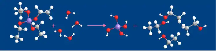 C'est la première réaction sur les groupements alkoxy du précurseur. L'eau introduite dans une solution alcoolique de TEOS hydrolyse les groupements éthoxy en groupements silanol (Si-OH) et produit de l'éthanol. Cette réaction est catalysée en milieu basique et en milieu acide, sa vitesse est minimale à pH 7.