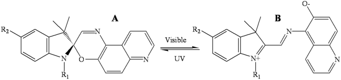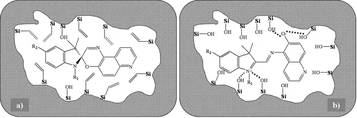 Le photochromisme des composés du type de celui reporté figure 11 est observé à l’état liquide dans différents solvants et à l’état solide lorsque les molécules sont piégées dans des matrices polymériques organiques. Les applications potentielles des photochromes organiques sont importantes et variées, en particulier dans les domaines des matériaux à transmission optique variable (« verres organiques » photochromiques) et celui du stockage optique de l’information. L’introduction des molécules dans des matrices hybrides organiques-inorganiques, en particulier celles préparées à partir de précurseurs alkylalkoxydes, conduit à un comportement photochromique comparable à celui observé dans les polymères organiques classiques. Le photochromisme est dit normal et les échantillons incolores sont transformés en xérogels colorés par irradiation UV. La forme stable dans ces matrices hybrides est donc la forme A (figure 12a). Lorsque les molécules sont introduites dans un xérogel purement inorganique, la forme B ionique est stabilisée par liaison hydrogène avec les groupes silanols de la matrice gel. Le photochromisme est alors inverse : les gels sont décolorés par action de la lumière visible (figure 12b).