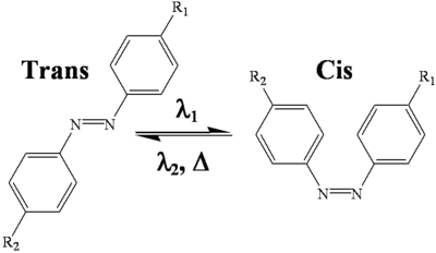 Les colorants de la famille des azobenzènes peuvent subir une réaction de photoisomérisation de la forme trans à la forme cis lorsqu’ils sont soumis à une irradiation lumineuse de longueur d’onde précise (figure 13). Le retour vers la forme thermodynamiquement plus stable (isomère trans) s’effectuant de façon photochimique ou thermique.
