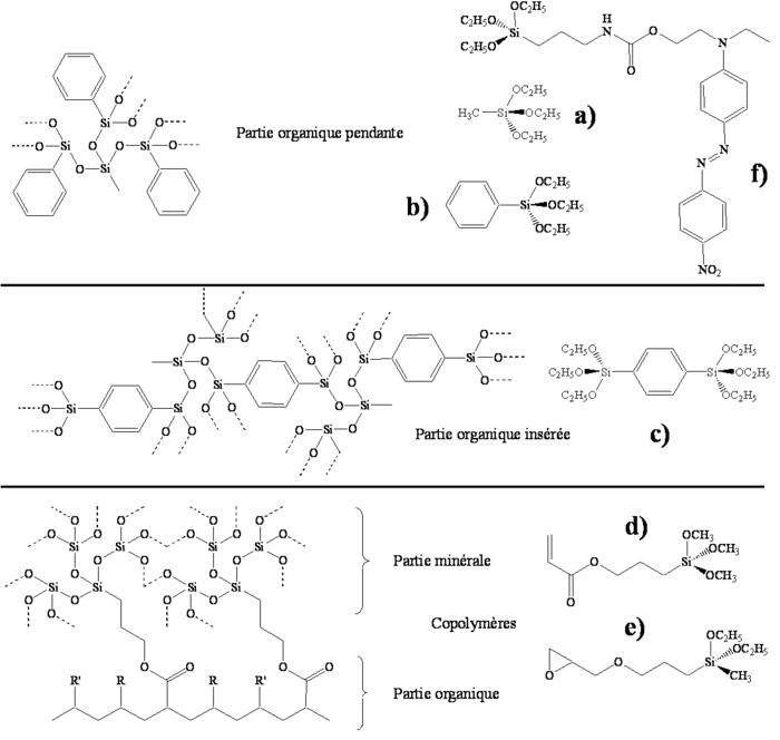 Les figures 8a et 8b donnent des exemples de chaînons organiques modificateurs utilisés dans la technologie hybride. Ils confèrent au matériau final des propriétés spécifiques (accentuation du caractère hydrophobe, amélioration de certaines propriétés mécaniques, etc.). Ils se retrouvent alors comme unités pendantes. Dans le cas de la figure 8c, la partie organique est intégrée au réseau minéral. Par ailleurs la présence de groupements organiques polymérisables (formateurs) permet d’envisager une double polymérisation, organique et minérale. Les molécules décrites figures 8d et 8e portent respectivement une fonction acrylate et époxyde. Ces matériaux hybrides intermédiaires entre verre minéral et polymère organique offrent un large éventail de propriétés inédites fruit de l’association des deux mondes minéral et organique.