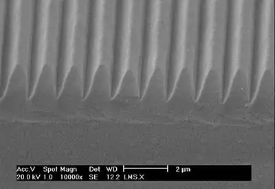 Pour les matrices faiblement réticulées, le déplacement de matière intervient précisément lorsqu’une figure d’interférences créée à partir d’un laser est projetée sur le matériau (film mince de l’ordre du micromètre). Dans les zones éclairées de cette figure d’interférence la photoisomérisation des azobenzènes intervient et provoque une migration moléculaire conduisant à l’inscription de réseaux de surface. La figure 15 donne un aperçu de cette déformation de surface observée en microscopie électronique à balayage.