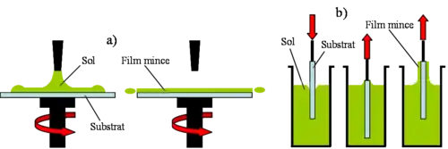La souplesse du procédé sol-gel permet de mettre le matériau final sous diverses formes, parmi lesquelles les monolithes (matériaux massifs de quelques mm³ à quelques dizaines de cm³) et les films minces (de quelques nanomètres à quelques dizaines de micromètres d'épaisseur). Ils sont préparés à partir du sol. Dans ce cas l'évaporation du solvant est très rapide et le passage par l'état de gel n'est souvent que conceptuel. Les deux types de procédés utilisés pour former des films minces, l'enduction centrifuge (ou spin coating) et l'enduction par trempage (ou dip-coating) sont présentés respectivement sur la figure 6a et la figure 6b. Lors du dépôt sur un substrat par chacune de ces techniques, l'évaporation du solvant est un élément important. En effet juste après le dépôt et avant le traitement thermique une grande partie du solvant s'est évaporée. L'étape de séchage des films minces est en général beaucoup plus courte que pour les matériaux massifs.