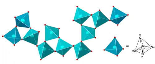 Cette réaction forme un pont siloxane (Si-O-Si) à partir de la condensation de deux groupements silanol et libère une molécule d'eau. Elle peut aussi avoir lieu entre un groupement éthoxy et un groupement silanol pour former un pont siloxane et libérer une molécule d'éthanol. Ces ponts siloxanes sont les unités de base du polymère inorganique. Dans les architectures moléculaires ainsi formées la « brique de base » est un tétraèdre (SiO44−) au centre duquel se trouve l’atome de silicium (figure 3), on retrouve d’ailleurs cette brique dans les verres à base de silice élaborés à haute température. Pour le TEOS, la réaction de condensation présente une vitesse minimale pour un pH de 2 ou 3. Pour des pH élevés, la réversibilité de la réaction peut devenir importante. Pour un précurseur R'-Si(OR)3 où R' est un groupement organique non-hydrolysable, la vitesse minimale de condensation est déplacée vers pH=4.