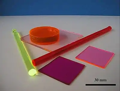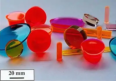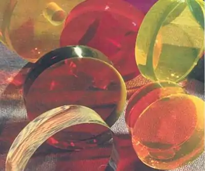 ![]() Figure 9b : échantillons de xérogels monolithiques de formes diverses dopés avec des molécules de colorants[8]. |