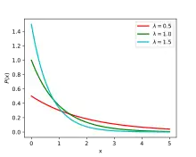 Une chaîne de Markov à temps continu (Xt)t≥0 est un processus stochastique. Chaque Xt est une variable aléatoire qui indique dans quel état le système se trouve à l'instant t. Par exemple, il peut faire beau ou alors pleuvoir. Supposons qu'il fasse beau au début, autrement X0 = beau. Le processus reste pendant un moment dans l'état beau. Par exemple X0 = ... = X0.001... = X0.401... = X0.499... = beau. Puis par exemple, le processus change d'état au temps 0.5, et va dans l'état pluie. Le temps d'attente dans l'état beau suit une loi exponentielle (voir fonctions de densité dans la figure de droite) d'un certain paramètre. Là dans l'exemple, le temps d'attente était de 0.5. Puis le processus reste un moment dans l'état pluie X0.5 = ... = X0.656... = pluie.