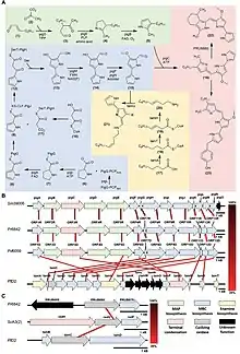 ![]() Transformations chimiques et clusters de gènes pour les voies de biosynthèse de la prodiginine[14]. |