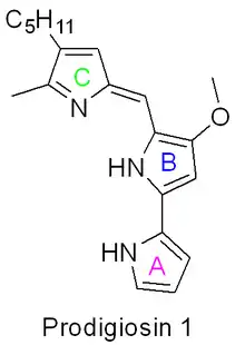 - (en) Cet article est partiellement ou en totalité issu de l’article de Wikipédia en anglais intitulé « Prodigiosin » (voir la liste des auteurs).