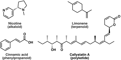 Les classes structurales générales des métabolites secondaires comprennent les alcaloïdes, les phénylpropanoïdes, les polycétides et les terpénoïdes[10], qui sont décrits plus en détail dans la section sur la biosynthèse ci-dessous.