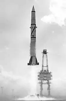Le développement de la fusée Hermes A-1 (CTV-G-5/RV-A-5) de 25 pieds (7,62 m) a été lancé par General Electric en 1946. Construite principalement en acier, il s'agissait d'une version américaine du missile anti-aérien allemand Wasserfall ; ce dernier était environ deux fois plus petit que la fusée allemande V-2[23]. La forme aérodynamique du Wasserfall a été adoptée plus tard pour le NATIV nord-américain. L'Hermès A-1 présentait une différence majeure par rapport au Wasserfall. Le moteur P IX alimenté par de l'acide nitrique et de l'éther de vinyle et d'isobutyle de Peenemünde a été remplacé par un moteur General Electric alimenté par de l'oxygène liquide et de l'alcool[35],[36], d'une poussée de 6123 kg (13 500 livres). À partir de 1947, le moteur de l'A-1 a été testé à la Malta Test Station de General Electric à New York[37]. Le moteur General Electric possédait un nouvel injecteur de carburant qui a eu une grande influence sur le développement futur des moteurs aux États-Unis. Des problèmes d'instabilité de la combustion ont retardé le développement du moteur[38].