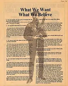 Le Black Panther Party a pris de l'importance pendant la guerre du Viêt Nam, de sorte que la section « Ce que nous croyons » incluait également une demande que les Noirs soient dispensés du service militaire auprès d'un « gouvernement raciste qui ne nous protège pas... NOUS ne nous battrons pas et ne tuerons pas d'autres personnes de couleur dans le monde qui, comme les Noirs, sont victimes du gouvernement raciste blanc d'Amérique »[4].