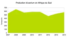 L'Afrique du Sud produit environ 550 tonnes de concentrés d'uranium par an, ce qui représente environ 1 % de l'extraction de l'uranium dans le monde. Les réserves d'uranium sont estimées à environ 6 % des ressources mondiales en uranium[8].