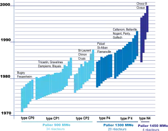 Après le succès des réacteurs expérimentaux de Marcoule, Électricité de France est chargée de mettre en place le programme électronucléaire français. De 1963 à 1971, six réacteurs sont mis en service à la centrale nucléaire de Chinon, à la centrale nucléaire de Saint-Laurent-des-Eaux et à la centrale nucléaire du Bugey. En fin de période, le nucléaire fournit 5 % de l'électricité produite en France[A 8].