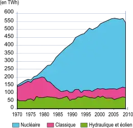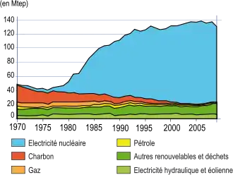 Après le déploiement du programme nucléaire militaire, l'industrie nucléaire devient progressivement la principale source de production d'électricité en France. Le nucléaire couvre, en 2016, 72 % de la production française d'électricité, qui représente elle-même 27 % de la consommation finale d'énergie du pays[é 1].