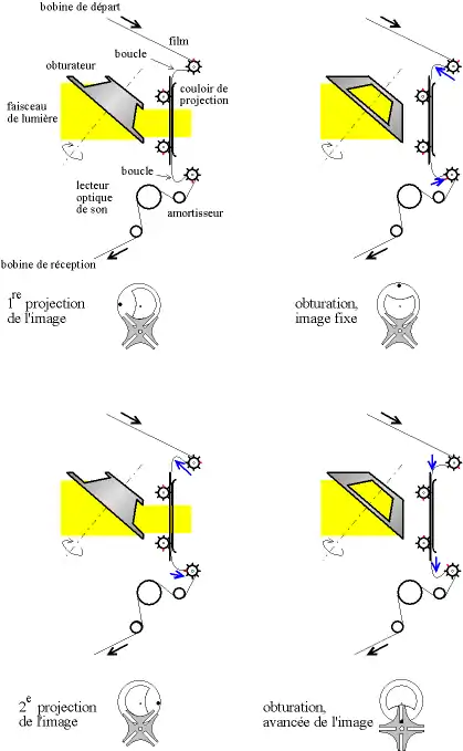 - obturation pour éviter l'effet de scintillement, le film reste fixe devant le couloir de projection ; la boucle du haut s'agrandit, celle du bas diminue ;