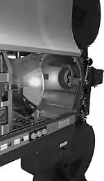 Le film s'enroule également sur un plateau horizontal. En fin de projection, il suffit d'échanger les noyaux amovibles — noyau avec système d'asservissement pour l'émission de film, noyau cylindrique pour sa réception —, puis de recharger le film dans le projecteur.