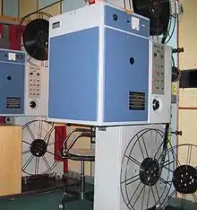 Il faut au minimum deux plateaux pour diffuser un film. Avec trois plateaux, on peut diffuser deux films en alternance dans la même cabine. Dans la photographie ci-contre, le film se déroule du plateau du milieu et s'enroule sur le plateau du haut ; le plateau du bas contient un film en attente de projection.