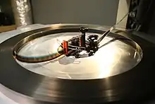 L'idée consiste donc à dérouler le film par le centre. On pose donc le film sur un plateau horizontal, et l'on enlève le noyau. Si l'on tire simplement sur le film, on obtient une spirale ; le plateau tourne donc pour éviter que le film ne s'entortille. La vitesse de rotation est pilotée par un asservissement, ce sont les deux rouleaux rouges qui se déplacent selon un arc de cercle sur la photographie ci-contre. Si la bobine tourne trop vite, les rouleaux se déplacent vers la droite, si elle tourne trop lentement, ils se déplacent vers la gauche. Le mouvement de ces rouleaux fait contact avec des micro interupteurs de part et d'autre qui déclenchent l'accélération ou le freinage du plateau afin de maintenir un déroulement constant.