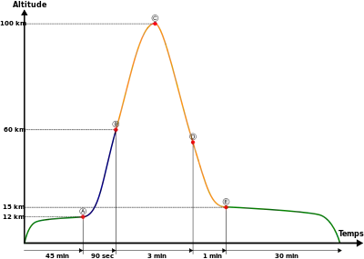 B: Extinction du moteur fusée. Accélération 3 g. Début de la phase d'impesanteur.