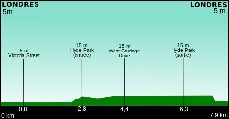 Il s'agit d'un parcours contre-la-montre de 8 kilomètres dans les rues de Londres. Le parcours qui consistait en un circuit en boucle démarrait à Trafalgar Square non loin de Big Ben pour passer par Whitehall vers l'abbaye de Westminster puis le palais de Buckingham pour entrer dans Hyde Park et finir dans St James' Park. Ce profil à plat au travers des lieux prestigieux de la capitale britannique, est une course courte qui se joue dans les 10 minutes.