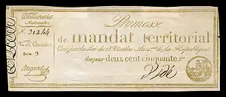 Le 28 ventôse an IV (), l'assignat est définitivement remplacé par un nouveau système, la « promesse de mandat territorial » (pour les grosses valeurs) ou « mandat territorial » (pour les petits montants), inspiré par les rescriptions de l'emprunt forcé émises depuis et dont l’État se servait pour régler ses opérations courantes.