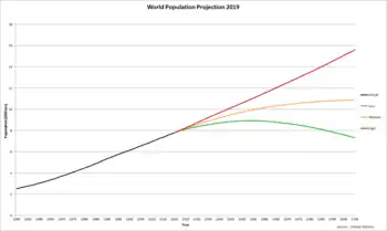 Pour le démographe, se projeter à échelle mondiale au-delà de 50 ans est un exercice très difficile. En effet, des variations apparemment faibles de la fécondité considérée à un instant "t", combinées à une tendance à l'allongement de l'espérance de vie, conduisent après quelques décennies à de grandes différences dans la taille des populations[5]. Ces différences, à partir d'un point de départ de 7 milliards d'habitants, se mesureront en centaines de millions ou en milliards de personnes en plus ou en moins 50 ou 100 ans plus tard. Et la différence entre les scénarios envisagés s'accentue avec le temps[5].