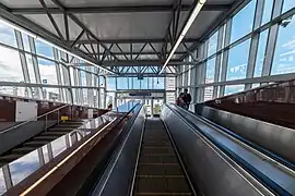La station dispose, en surface, de quatre bouches couvertes, deux au nord desservent le hall souterrain nord et deux au sud desservent le hall souterrain sud. Chacun des halls est relié au quai par un tunnel en pente équipé d'escaliers mécaniques[2].