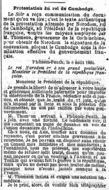 Les premières décennies du protectorat sont l'occasion de frictions entre les autorités françaises de Saïgon et la cour de Phnom Penh. La France, trouvant la monarchie cambodgienne trop dispendieuse, impose une réduction de son train de vie et des réformes structurelles, incluant notamment l'abolition de l'esclavage au Cambodge. Après vingt ans d'administration indirecte, les autorités du protectorat souhaitent rationaliser le système d'exploitation et l'étendre au pays tout entier. Le , le gouverneur de Cochinchine Charles Thomson se rend à Phnom Penh avec des troupes et exige du roi Norodom, alors malade et alité, qu'il signe une convention sur les douanes en vue d'une union douanière de l'Indochine française. À l'aube du , le palais du roi est envahi par des troupes françaises et Thomson, alléguant que le roi aurait manqué de respect à la République lors d'une audience antérieure et l'informant qu'il renonce à la convention des douanes déjà signée, ordonne au roi de signer dans la demi-heure un nouveau traité qui renforce le protectorat en donnant la gestion des affaires intérieures aux Français[6]. Malgré les protestations du roi adressé au président de la République[7], le traité, qui transforme le protectorat du Cambodge en colonie de fait, est ratifié par le gouvernement français.