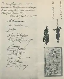 Le protocole de paix Boxer est signé le dans la légation espagnole de Pékin. Le prince Qing et Li Hongzhang signèrent le protocole au nom de la Chine. Alfons Mumm (baron von Schwarzenstein), Ernest Mason Satow et Komura Jutaro signèrent respectivement au nom de l'Allemagne, de la Grande-Bretagne, et du Japon.