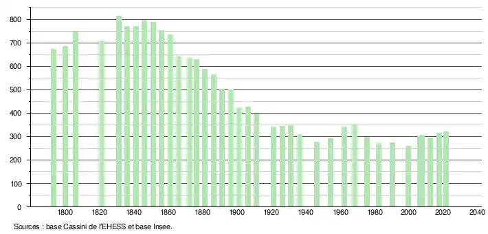 L'évolution du nombre d'habitants est connue à travers les recensements de la population effectués dans la commune depuis 1793. Pour les communes de moins de 10 000 habitants, une enquête de recensement portant sur toute la population est réalisée tous les cinq ans, les populations légales des années intermédiaires étant quant à elles estimées par interpolation ou extrapolation[20]. Pour la commune, le premier recensement exhaustif entrant dans le cadre du nouveau dispositif a été réalisé en 2007[21].