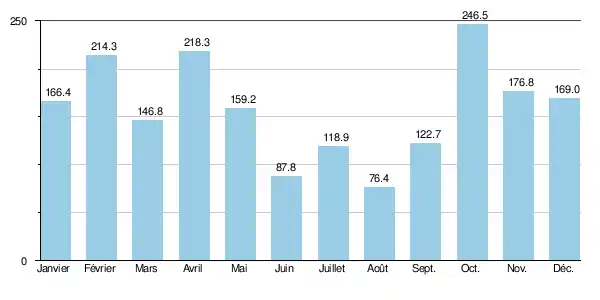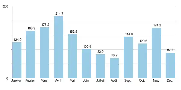 | Précipitations (mm) | 124 | 163,9 | 176,2 | 214,7 | 152,5 | 100,4 | 82,9 | 70,2 | 144 | 120,6 | 174,2 | 87,7 | 1 611,3 |