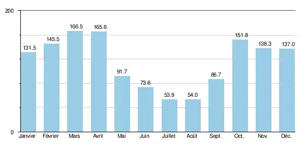 | Précipitations (mm) | 131,5 | 145,5 | 166,5 | 165,6 | 91,7 | 73,6 | 53,9 | 54 | 86,7 | 151,8 | 138,3 | 137 | 1 396,1 |