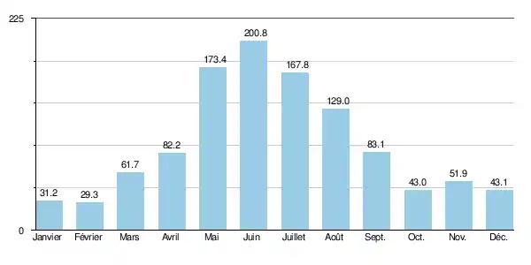 | Précipitations (mm) | 31,2 | 29,3 | 61,7 | 82,2 | 173,4 | 200,8 | 167,8 | 129 | 83,1 | 43 | 51,9 | 43,1 | 1 096,5 |