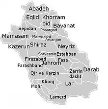 Les anciens 25 [voir carte] sont les suivants : Abadeh, Eqlid, Khorrambid, Bavanat, Sepidan, Pasargad, Mamasani, Marvdasht, Arsanjan, Kazeroun, Shiraz, Nayriz, Sarvestan [avant dans Shiraz], Estahban, Firouzabad, Fasa, Farashband, Jahrom, Qir va[et] Karzin, Zarrindasht, Darab, Mohr, Khonj, Lar|s[Larestan] et Lamerd.