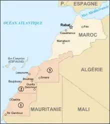 Le territoire du Sahara occidental  déclaré comme territoire non autonome par l'Organisation des Nations unies[10]  est en conflit depuis 1975. Le Maroc occupe[11] environ 80 % du territoire, et la partie restante est administrée par la rasd.