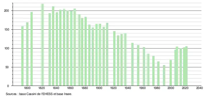 L'évolution du nombre d'habitants est connue à travers les recensements de la population effectués dans la commune depuis 1793. Pour les communes de moins de 10 000 habitants, une enquête de recensement portant sur toute la population est réalisée tous les cinq ans, les populations légales des années intermédiaires étant quant à elles estimées par interpolation ou extrapolation[30]. Pour la commune, le premier recensement exhaustif entrant dans le cadre du nouveau dispositif a été réalisé en 2008[31].