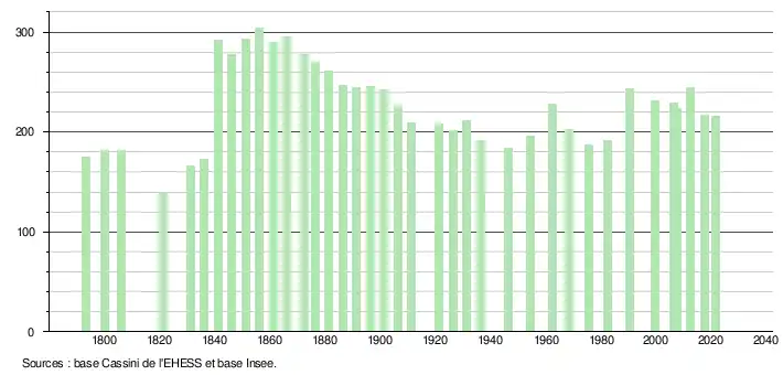 L'évolution du nombre d'habitants est connue à travers les recensements de la population effectués dans la commune depuis 1793. Pour les communes de moins de 10 000 habitants, une enquête de recensement portant sur toute la population est réalisée tous les cinq ans, les populations légales des années intermédiaires étant quant à elles estimées par interpolation ou extrapolation[18]. Pour la commune, le premier recensement exhaustif entrant dans le cadre du nouveau dispositif a été réalisé en 2007[19].